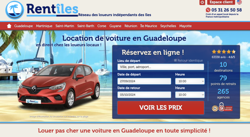 Pour comparer facilement les tarifs des principaux loueurs de voitures en Guadeloupe et obtenir le meilleur prix, nous vous recommandons notre partenaire Rentiles. Ce service pratique vous permet de trouver en un clin d’œil les offres de location les plus avantageuses sur l’île, garantissant ainsi un excellent rapport qualité-prix pour votre séjour. Grâce à Rentiles, profitez d’une totale transparence dans les prix et réservez votre véhicule au meilleur tarif sans effort.
